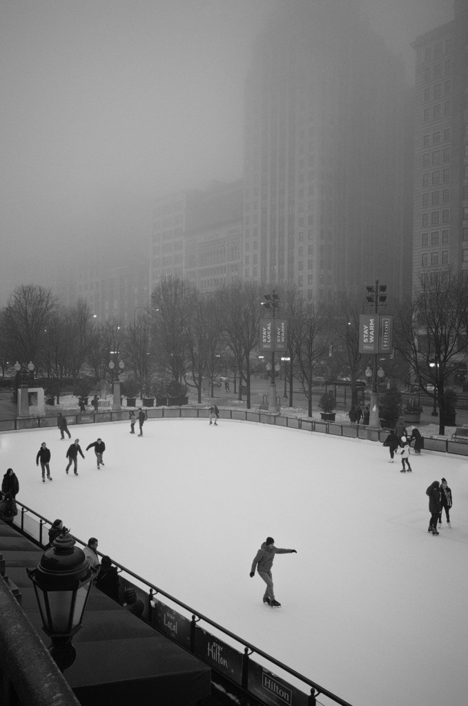 Bottom of the picture gives off ample contrast, crisp outlines and nearly full dynamic range. Yet, once you move up to the far edge of the rink the fog starts setting in and once in the tree line it feels as though you are looking at a completely different photograph. The difference is so stark that a thumbnail of this photo almost looks photoshopped and that’s what caught my eye.