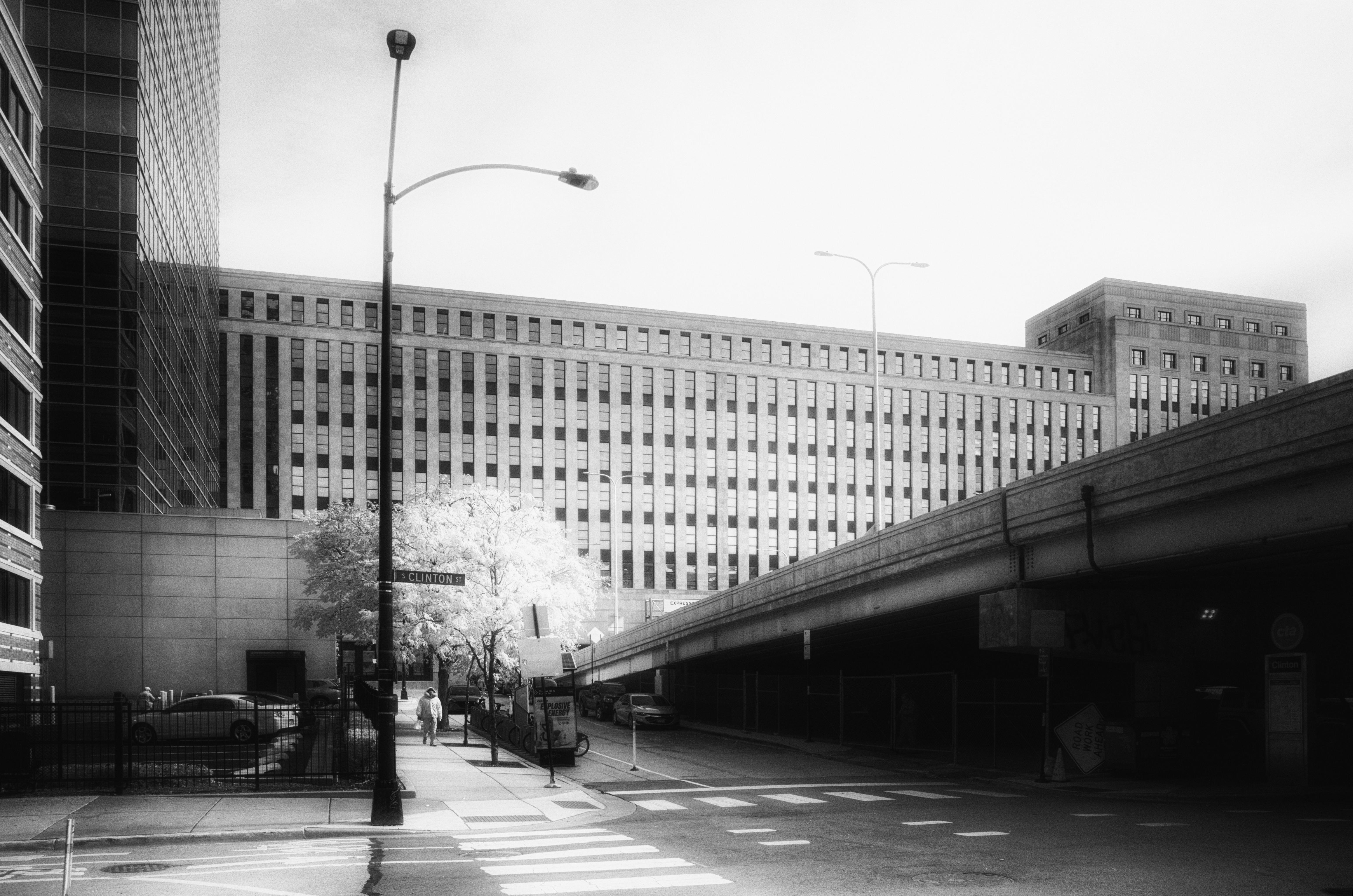 This two and a half million square foot behemoth is being gutted and refinished into office space, its enormous grand lobby restored to its original glory from a hundred years ago and all the floor space brought up to today’s standard for office needs (will there be any need with what the pandemic has done to us all?). What a bizarre piece of architectural prowess this is: not only is it enormous, but this building also has a train line and one of Chicago’s busiest expressways running right under it as seen in the photo below with the elevated 8-lane I-290 Eisenhower expressway (The Ike) diving straight into the bowels of the building! This point is also the actual end of the I-290 where it turns into a regular Chicago’s street (Ida Wells) as soon as it passes the river in the other side of the Post Office complex.